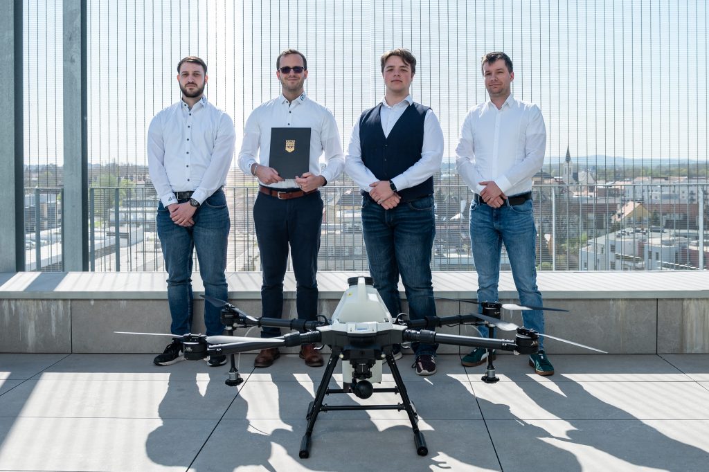 A Magyar Innovációs Nagydíjon elismerésben részesült környezetbarát permeteződrón az Uni Inno Zrt., illetve az egyetem Digitális Fejlesztési Központjának egyik kiemelkedő eredménye, amely az elérhető termékek valamennyi előnyös tulajdonságát egyesíti. Dinamikus akadálykerülési és útvonaltervezési funkciói precízebbé teszik a permetezést, ezáltal akár 75 százalékos költségcsökkenés és négyszeres munkatempó érhető el a traktoros permetezéshez képest. „A hatékonyság növelésével az eszköz nemcsak gazdaságilag előnyösebb, de környezetbarát megoldást is nyújt. A termőterület földrajzi adottságaihoz való rugalmasabb alkalmazkodása révén pedig a speciális gazdálkodói igényeket is képes kielégíteni” – részletezte Takács Olivér, a Digitális Fejlesztési Központ helyettes vezetője.