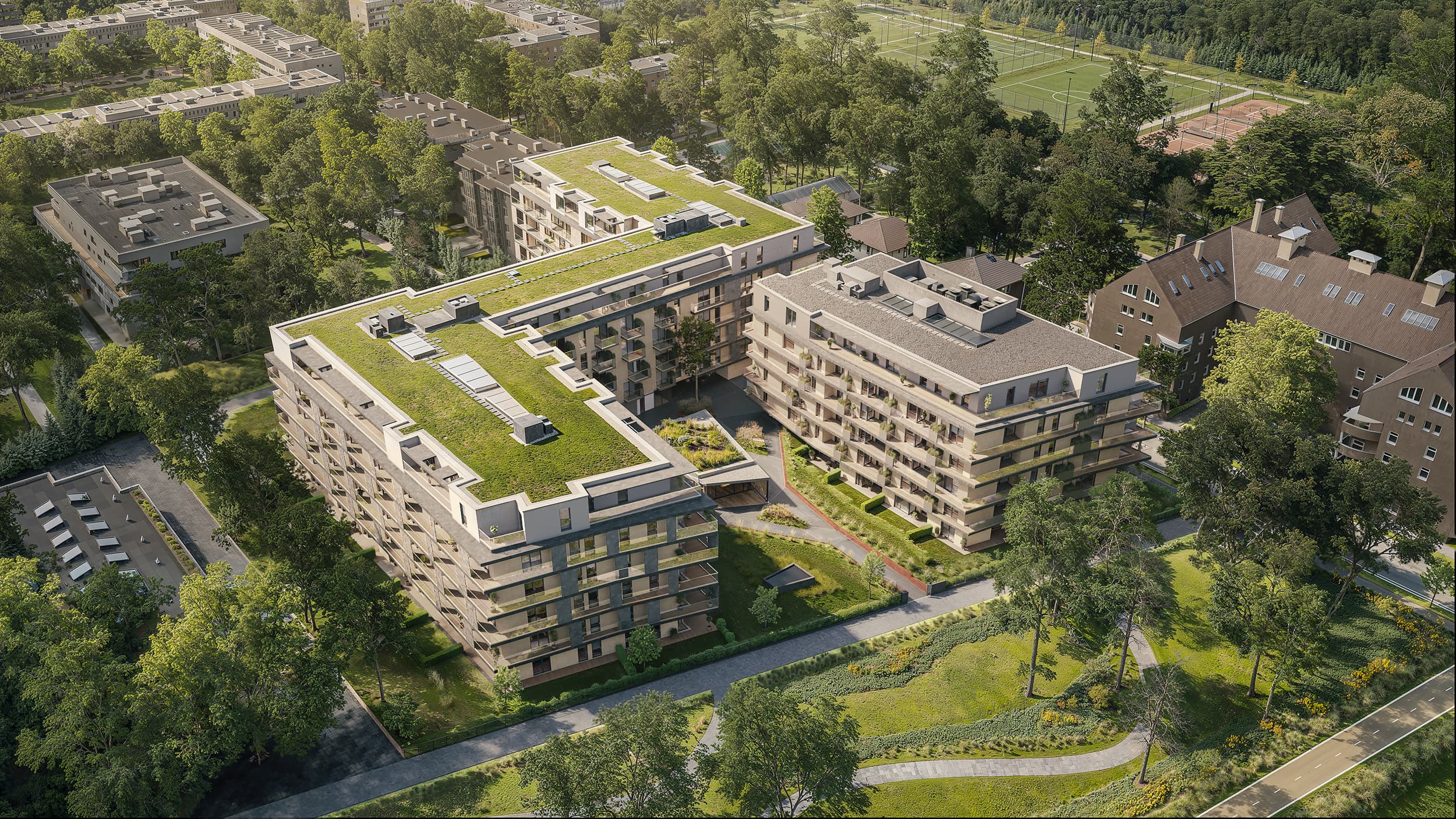 A projektben kiemelt szerepet kapott a tájépítészet, amely hozzájárul a lakópark élhetőségéhez és egyedi hangulatához. Az emberközpontú épület zöldtetős kialakítással, valamint tágas belső udvarral rendelkezik, ahol a sétányok, pihenőterek és közösségi terek találkoznak. A lakópark központi részén egy fitneszterem is megvalósul. A Rákos-patak mentén végig futó zöld sáv, illetve a Városliget közelsége számos kikapcsolódási lehetőséget kínál.