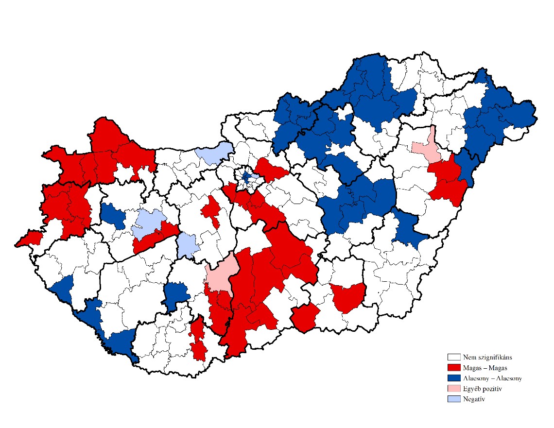 A kutatók kíváncsiak voltak arra is, hogy a szomszédos járások lakóinak “napelemkedvelése” mennyire hasonlít egymáshoz (2. ábra). Összefüggő “forró” területeket találtak Bács-Kiskun, Győr-Moson-Sopron, illetve Vas vármegye nagy részén, a “hideg” területek — vagyis a napelemben szegényebbek — pedig számos járást lefedtek az ország délnyugati és északkeleti részén, de ide tartoznak Budapest belvárosának kerületei is (amit egyértelműen magyaráz a sűrű beépítettség).