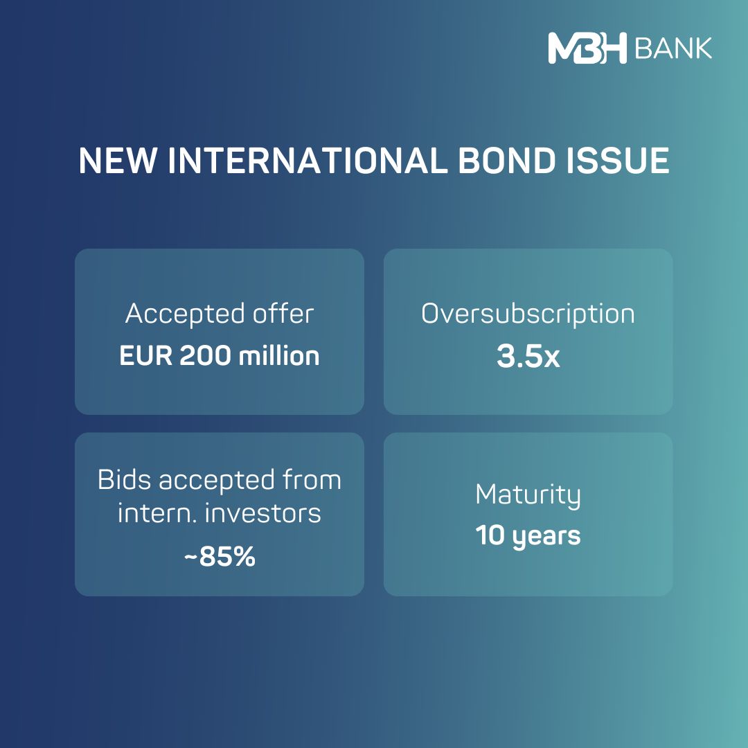 Újabb sikeres nemzetközi kötvénykibocsátást hajtott végre az MBH Bank, amely iránt ezúttal is kiemelkedő befektetői érdeklődés mutatkozott. Az MBH Bank Nyrt. első nemzetközi Tier 2-es kötvénykibocsátása során 3,5-szeres túljegyzés mellett, több mint 700 millió euró értékű befektetői ajánlat érkezett be április 29-én. A hitelintézet végül 200 millió euró össznévértékű kötvénykibocsátásról döntött, amelynek mintegy 85%-a nemzetközi befektetőktől érkezett. A jegyzés sikere újfent megerősíti az MBH Bank nemzetközi tőkepiaci ismertségét és egyben újabb lépést jelent a nemzetközi tőkepiaci jelenlét erősítéséhez.