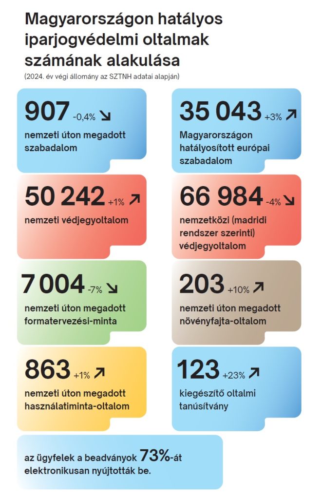 Bár 2024-ben nemzetközi szinten és Európában alig változott az iparjogvédelmi aktivitás, hazánkban jelentős növekedés volt jellemző, derül ki a Szellemi Tulajdon Nemzeti Hivatala (SZTNH) Tények & Adatok 2024 című kiadványából.