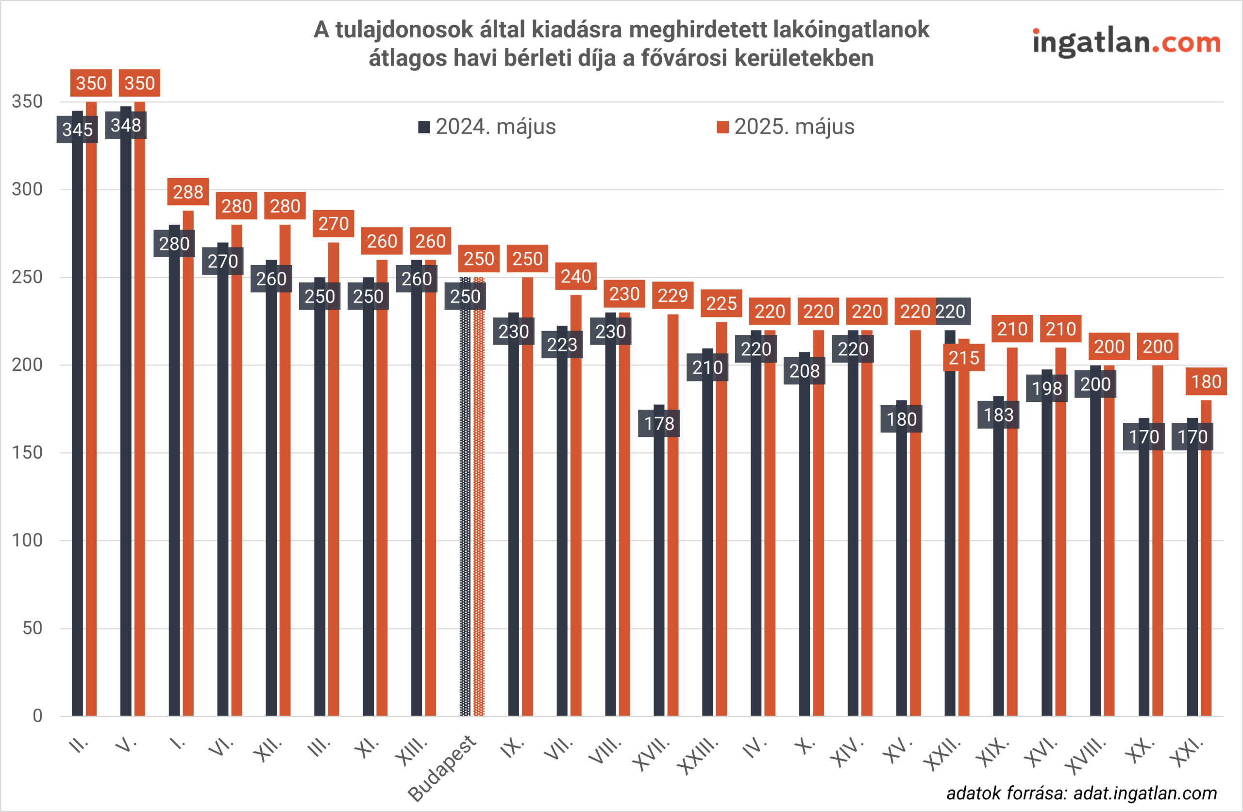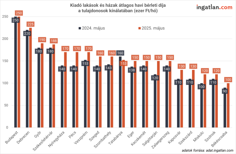 - A fővárosban május közepén átlagosan 250 ezer forint, Debrecenben 225 ezer, Szegeden, Győrben és Pécsen pedig 160-190 ezer forint a kiadó lakóingatlanok átlagos havi bérleti díja. A miskolci átlag 120 ezer forintnál tart.