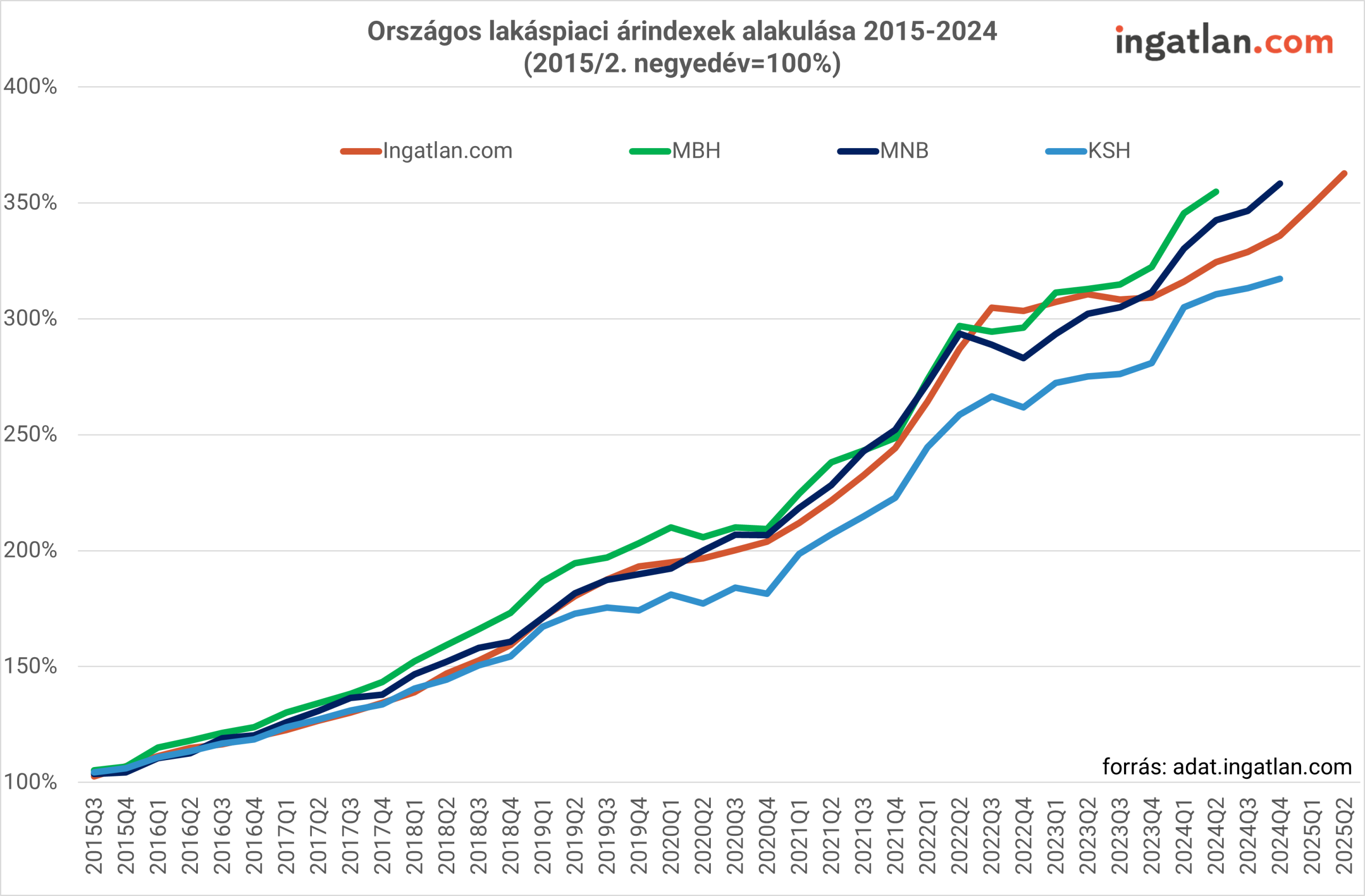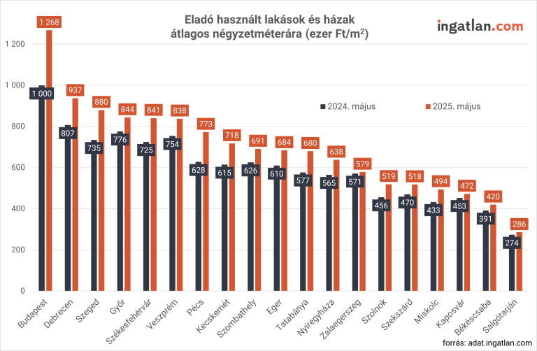 Az ingatlan.com adatai szerint 2025 májusában az V. kerület volt a legdrágább fővárosi kerület, ahol az eladó használt lakóingatlanok átlagos négyzetméterára megközelítette a 2 millió forintot. A legkedvezőbb árakkal továbbra is a XXIII. kerületben találkozhatnak a vevők, itt átlagosan 785 ezer forintba kerül egy négyzetméter. A többi nagyvárost tekintve Debrecenben 937 ezer, Szegeden pedig 880 ezer forint volt az átlagos négyzetméterár, így Szeged az elmúlt 2 évben a második legdrágább vármegyeszékhellyé lépett elő. Győrben 844 ezer, Pécsett 773 ezer, Miskolcon pedig 494 ezer forintot kértek a lakások négyzetméteréért. A legolcsóbb megyeszékhely továbbra is Salgótarján, ahol 2025 májusában mindössze 286 ezer forintba került átlagosan egy négyzetméternyi használt lakóingatlan.