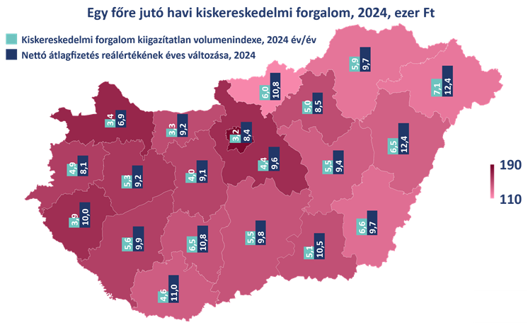 Tavaly a fizetések 39%-át költöttük el a kiskereskedelemben, ami a – kiskereskedelmi forgalmat tekintve igen komoly visszaesést mutató – covid événél is alacsonyabb érték. Míg 2024-ben a reálbérek 9,2%-kal növekedtek, addig a kiskereskedelmi volumen csak 2,6%-kal, vagyis egyfajta átrendeződés látszik a fogyasztási szerkezetben. Az ország a kiskereskedelmi költéseit tekintve földrajzilag is megosztott, amire a turizmus is hatással van.