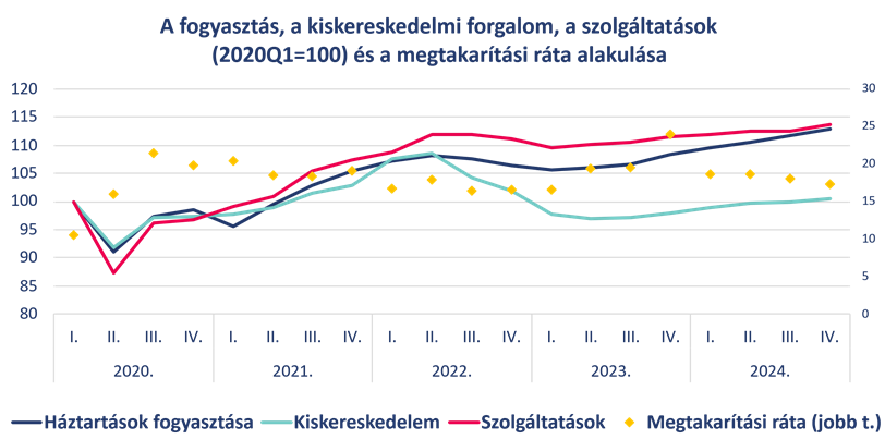 Felmerül a kérdés, hogy a megszerzett többletjövedelem hol jelenik meg? Egyrészt a covid és az inflációs sokk óta a magyar háztartások megtakarítási rátája historikusan magasnak tekinthető, és 2024-ben ez csak kis mértékben csökkent. Másrészt jelentős változás történt a háztartások fogyasztási szerkezetében: az inflációs sokk idején – 2022 második félévétől kezdve – a kiskereskedelmi fogyasztás jelentősen zuhant, és ezzel elvált a szolgáltatások fogyasztásának alakulásától, ami ezzel szemben csak kismértékben csökkent ugyanettől az időhorizonttól kezdődően, majd 2023-től, ha nem is érte el a korábbi növekedési ütemét, de enyhén növekvő pályára állt. A korábban együtt mozgó kiskereskedelmi fogyasztás és a szolgáltatások vásárlásának növekedése közötti olló ettől kezdve nagyra nyílt és 2023 óta lényegében nem szűkült, vagyis a fogyasztók egyelőre nem tértek vissza a korábbi vásárlási szokásaikhoz.