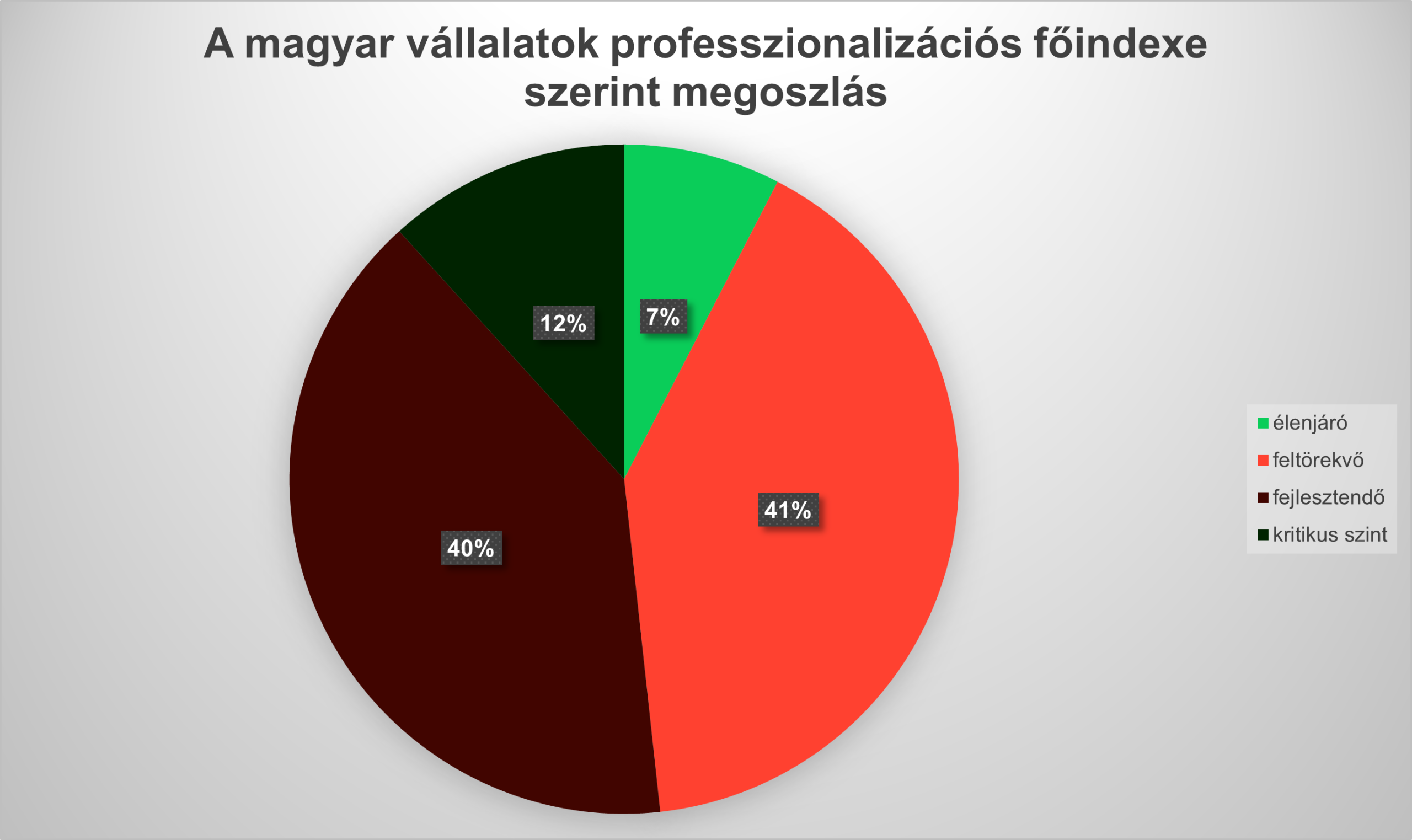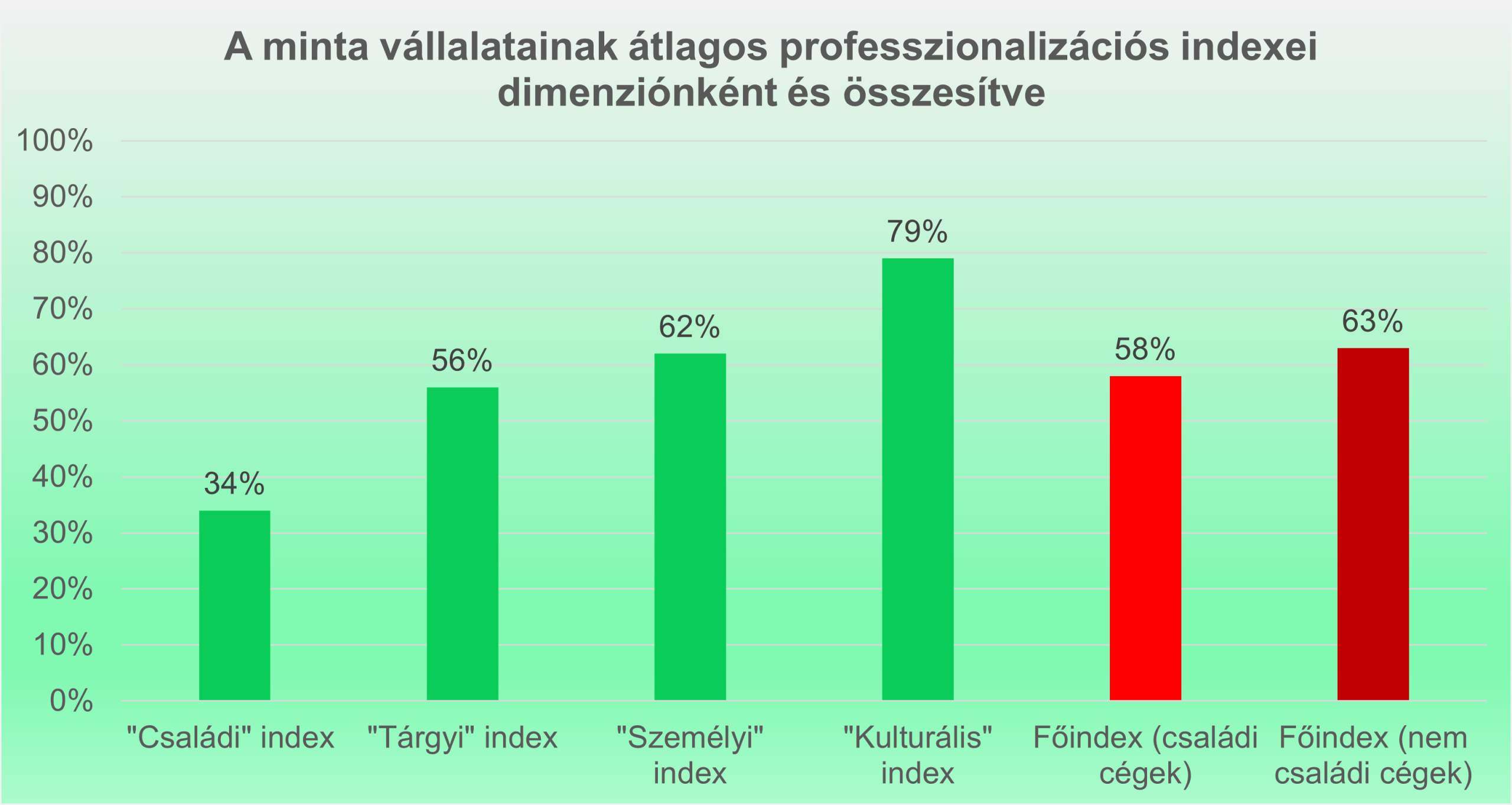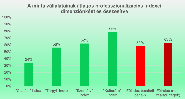 A 145, túlnyomórészt hazai családi tulajdonú vállalatot bevonó felmérés alapján a magyar családi cégek öt százalékponttal maradnak el felkészültségben a nem családi cégek szintjétől, átlagosan 58 százalékosan teljesítve. Az eredmények szerint a mintavállalatok több mint felében intenzív fejlesztés szükséges a sikeres professzionalizációhoz, és csupán 7 százalékuk számít élenjárónak.
