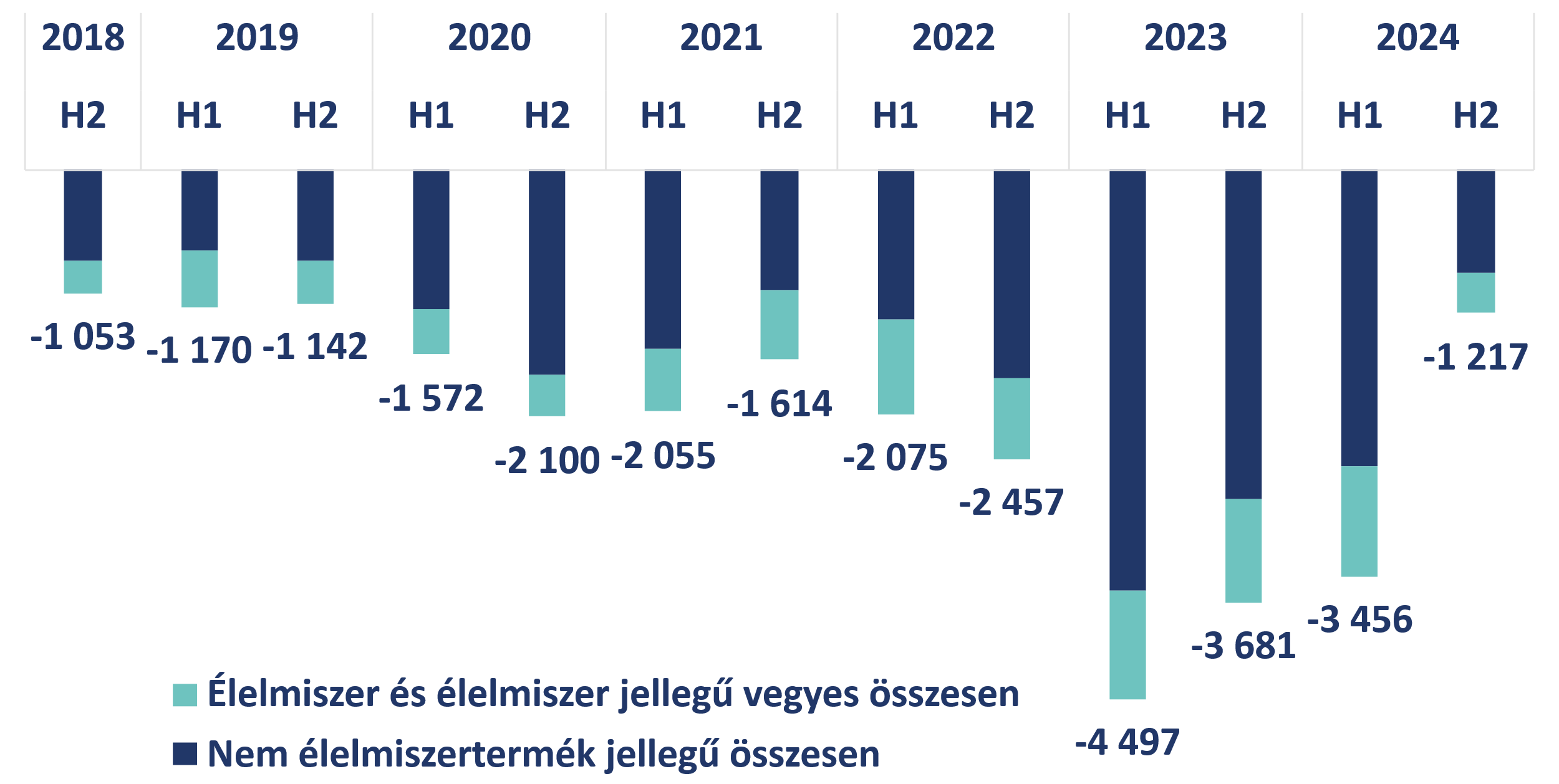 A kiskereskedelmi üzletek számára vonatkozó legfrissebb, 2024 második félévére vonatkozó adatok alapján a boltbezárások féléves üteme hirtelen a covid előtti években megszokott szintre csökkent: 1.217 üzlet zárt be, ami 1,3%-os csökkenést jelent (benzinkutak nélkül). Negatív csúcsnak 2023 első féléve számít az infláció okozta csökkenő kereslet és az ezzel egyidejűleg jelentkező megugró rezsiárak miatt. Ekkor 4.497 üzlet szűnt meg, onnan kezdve indult el egy lassú javulás, vagyis mérséklődött a bezáró üzletek száma. Mivel tavaly az első félévben még sokkal magasabb volt a megszűnt boltok száma, így összességében a teljes tavalyi évre vonatkozó érték 4.714, ami az elmúlt 5 év második legmagasabb száma. Az eddigiekhez képest lényegesen alacsonyabb féléves adat az említett sokkok okozta felgyorsult koncentráció végét jelezheti, a féléves csökkenés visszatérhet 1-2% közé, de erről biztosat csak az idei adatok ismeretében lehet majd mondani.