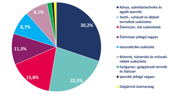 Bár az elmúlt 10 évben a humán- és az állatgyógyászati termékek üzletein kívül minden üzlettípus esetében csökkenő üzletszámról beszélhetünk, 2005-ig visszatekintve (a kiskereskedelmi üzletek számának maximumára) a nem élelmiszerüzletek közül jelentősen több telekommunikációs (+50%), takaró, szőnyeg, fal-, padlóburkoló- (+143,6%) és sportszer-szaküzlet (+40%) működik, míg az élelmiszer szaküzletek közül közel kétszer annyi a kenyér-, pékáru- és édességszaküzletek száma (+91,4%).