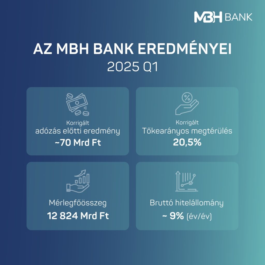 A bankcsoport korrigált adózás előtti eredménye 67,9 milliárd forint lett, a korrigált tőkearányos megtérülési mutatója pedig elérte a 20,5%-ot. A társaság mérlegfőösszege éves összevetésben csaknem 8,8%-ot növekedett, így több mint 12 824 milliárd forintot tett ki a negyedév végén. Az MBH Bank saját tőkéje a 2024. év végi 1 139,5 milliárd forintról1 143,2 milliárd forintra növekedett, tőkemegfelelési mutatója pedig 20%, amely továbbra is jelentősen meghaladja a szabályozói elvárásokat. Az MBH Bank az első negyedévben több mint 43 milliárd forint összegű bank- és extraprofitadót fizetett be a teljes évre vonatkozóan, érdemi mértékben hozzájárulva ezzel a központi költségvetéshez.