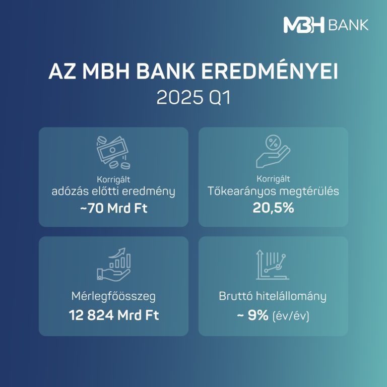 Stabilan magas jövedelmezőséggel zárta az első negyedévet az MBH Bank: mérlegfőösszege 12 824 milliárd forintra emelkedett, az erős lakossági hitelezési tevékenységnek köszönhetően bruttó hitelállománya pedig 8,6%-kal nőtt az előző év azonos időszakához képest. Emellett az idei év első hónapjait a portfólióminőség további javulása jellemezte, miközben a bank tőkehelyzete 20%-os tőkemegfelelés mutató mellett továbbra is rendkívül szilárd. Az első negyedévben az MBH Bank több mint 43 milliárd forint összegű bank- és extraprofitadót könyvelt el a teljes évre vonatkozóan. Az eredményes évkezdés összhangban van az MBH Bank stratégiai céljaival és stabil alapot biztosít az idei célszámok eléréséhez.