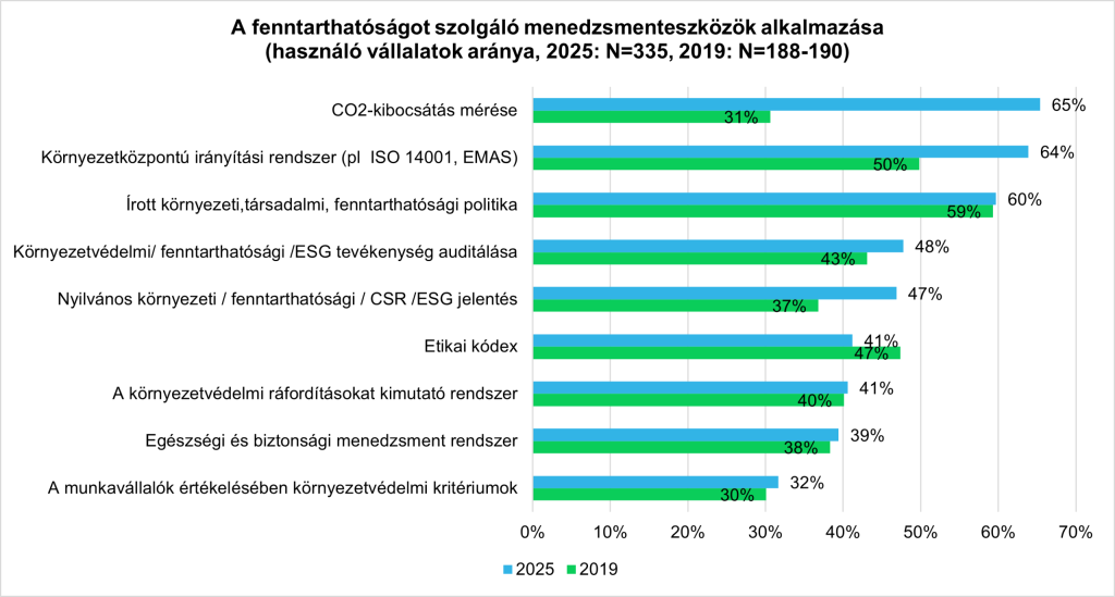 A fenntarthatósági menedzsmentre használt eszközök közül a leginkább a karbonkibocsátás mérése terjedt el, ezt a vállalatok csaknem kétharmada alkalmazza (65,4%). Ez az arány a kétszerese a 2019-es értéknek, feltehetően nagyrészt a szabályozói elvárások miatt. Hasonlóan népszerűek lettek a környezetközpontú irányítási rendszerek is (63,9%): egyre nőhettek ugyanis a beszállítókra vonatkozó környezetvédelmi elvárások.