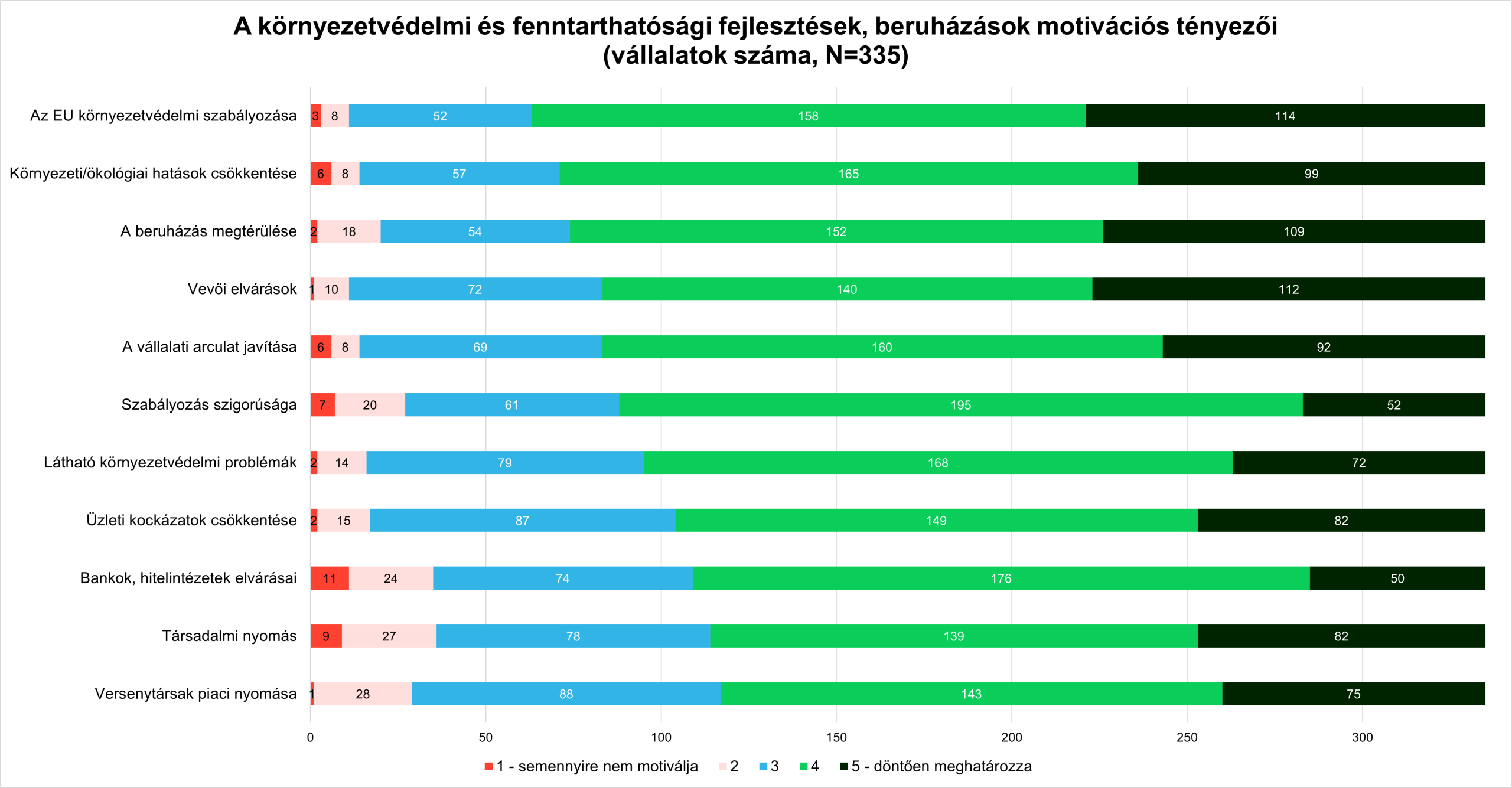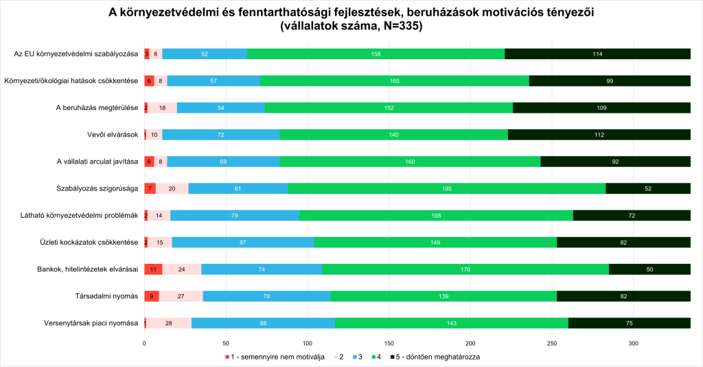 A környezetvédelmi fejlesztéseket leginkább meghatározó körülmény a magyar cégek számára szintén az EU hatósági szabályozása. A beruházásaikra másodsorban a környezeti hatások csökkentésének célja hat, és csak ezt követik a piaci szempontok (megtérülés, a vevői elvárások, arculat és az üzleti kockázatok csökkentése).