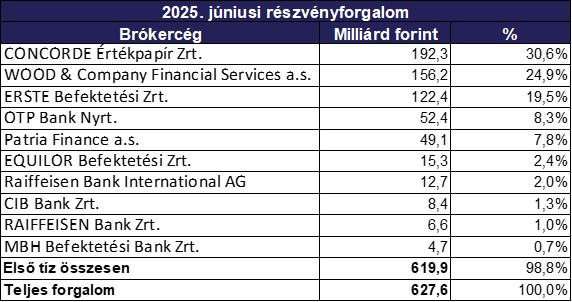 A befektetési szolgáltatók rangsorában, 192,3 milliárd forintos részvényforgalommal a Concorde végzett az élen, akit a WOOD & Company 156,2 milliárd és az ERSTE 122,4 milliárd forinttal követett.