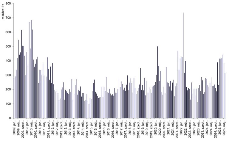 Az azonnali részvénypiac teljes havi forgalma 313,8 milliárd forintot, a napi átlagos forgalom pedig 15,7 milliárd forintot tett ki.