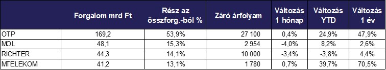 A legnagyobb forgalmat ezúttal is az OTP Bank részvényei generálták, 169,2 milliárd forint értékben. Ezt követte a MOL 48,1 milliárd, valamint a Richter Gedeon 44,3 milliárd forinttal. A közepes kapitalizációjú szegmensben az ZWACK és az ANY mutatott figyelemre méltó teljesítményt, míg a BÉT Xtend piacon az MULTIHOME részvényei emelkedtek ki.