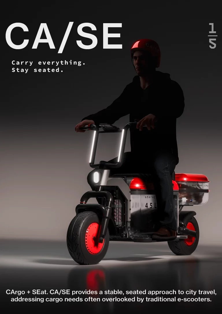 Takács Márton CA/SE koncepciója a városi e-rollerek jelenlegi korlátait kezeli: a biztonsági aggályokat és a rakodókapacitást. A projekt egyesíti az áruszállítás és a személyszállítás kényelmét, új szintre emelve a mikromobilitást.