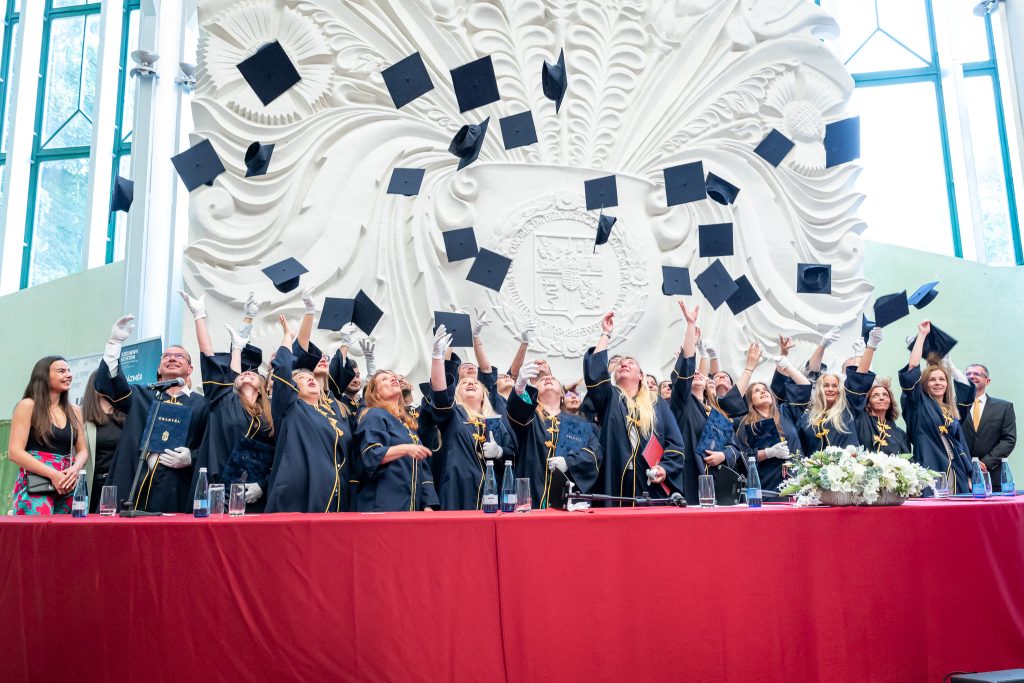 A diplomaátadón közösségi díjakat is átadtak: a Hallgatói Önkormányzat a Pro Auditoribus oklevél minősítésével ismerte el azokat, akik az egyetemi élet szervezésében, a közösség építésében és a hallgatói érdekérvényesítésben kiemelkedőt nyújtottak. Így Czuppon Benedek, Pankasz Medárd, Szöllőskei Réka Johanna, Marcsik Enikő és Tóth Dzsenifer Petra vehette át az elismerést. A végzősök nevében Sinkó Ferenc Ferdinánd búcsúzott – aki a Pro Auditorimus díj bronz minősítésében részesült –, személyes szavaival is megerősítve: az itt töltött évek nem csupán tanulást, hanem közösségi kötődést, barátságokat és értékeket is jelentettek.