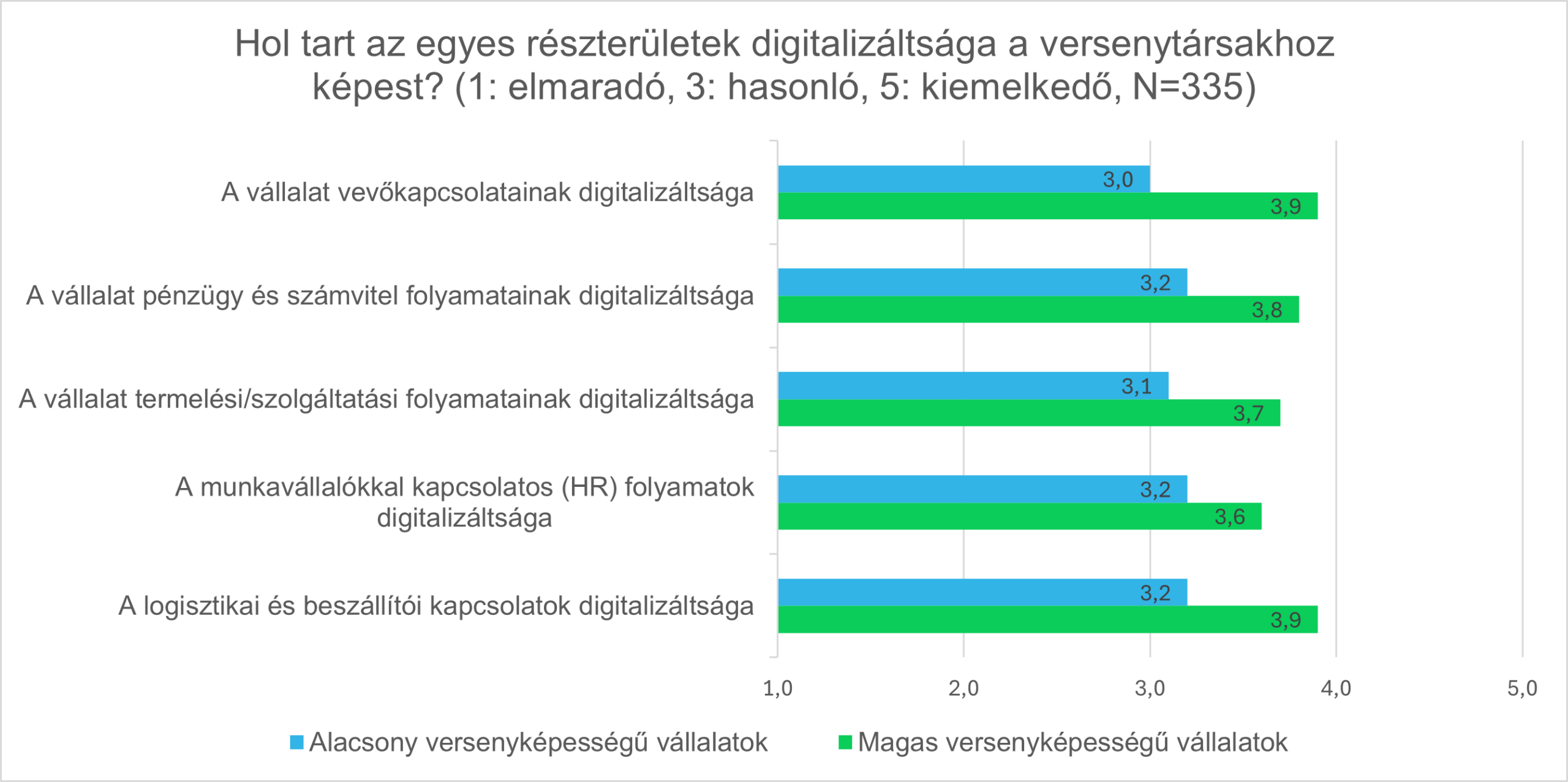 A felmérés szerint a vállalatok nagyjából fele gondolja azt, hogy digitalizációs fejlettsége a versenytársaihoz hasonló. A cégek a leginkább a logisztikai és beszállítói, valamint a vevőkapcsolatok digitalizáltsága terén érzik kiemelkedőnek magukat, utóbbi egyben választóvíz a kevéssé versenyképes és a nagyon versenyképes vállalatok között is. A versenyképesebb vállalatok a digitalizáció minden területén átlag felettinek látják fejlettségüket.