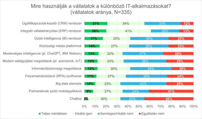Az eredmények szerint a legelterjedtebb informatikai technológiák az integrált vállalatirányítási (ERP) és az ügyfélkapcsolat-kezelő rendszerek (CRM), de ezekről is csak minden ötödik cég nyilatkozott úgy, hogy teljes mértékben része a működésüknek. Minden nyolcadik vállalatnál egyáltalán nem használnak ilyen technológiát. Az üzletiintelligencia-rendszereket és a közösségi platformokat minden hatodik, illetve hetedik vállalat alkalmazza teljes mértékben. A chatbotok használata terjedt el a legkevésbé: csupán a vállalatok 3 százaléka aknázza ki teljesen ennek az előnyeit.