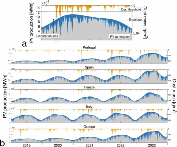 A kutatók a magyarországi helyzet már korábban elemezték, a “The shadow of the wind: the impact of Saharan dust on photovoltaic power generation in the Mediterranean” című cikkben ezúttal kiléptek a Kárpát-medencéből, és a mediterrán térség öt országában – Portugáliában, Spanyolországban, Franciaországban, Olaszországban és Görögországban – vizsgálták a szaharai por napelemes energiatermelésre gyakorolt hatásait a 2019–2023 közötti időszakban.