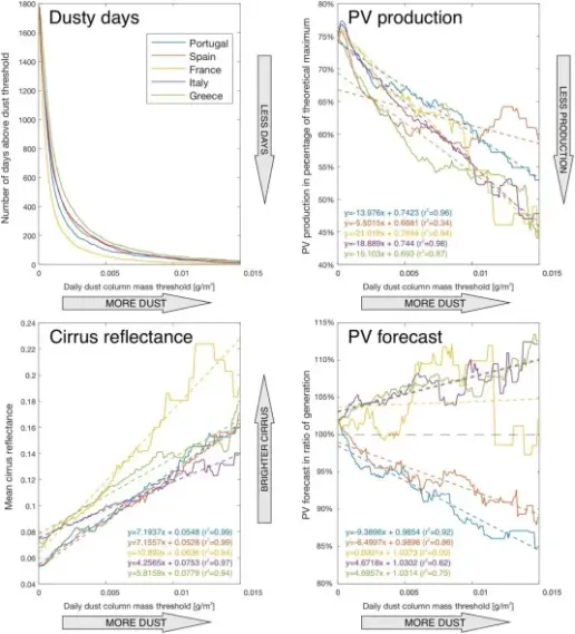 A PV termelést meghatározó besugárzás visszaesését két fő tényező okozza: (1) a por által kiváltott fényelnyelés és szórás; (2) valamint a fokozott cirrusfelhő-képződés, amely további sugárzáscsökkenést idéz elő. A kutatók azt is megfigyelték, hogy a képződött magasszintű felhők fényvisszaverő-képessége is megnőtt a por hatására, mivel a megnövekedett jégképző-porszemcseszám következtében több, kisebb jégszem képződött, mely a felhőzet világosabb színét eredményezte.