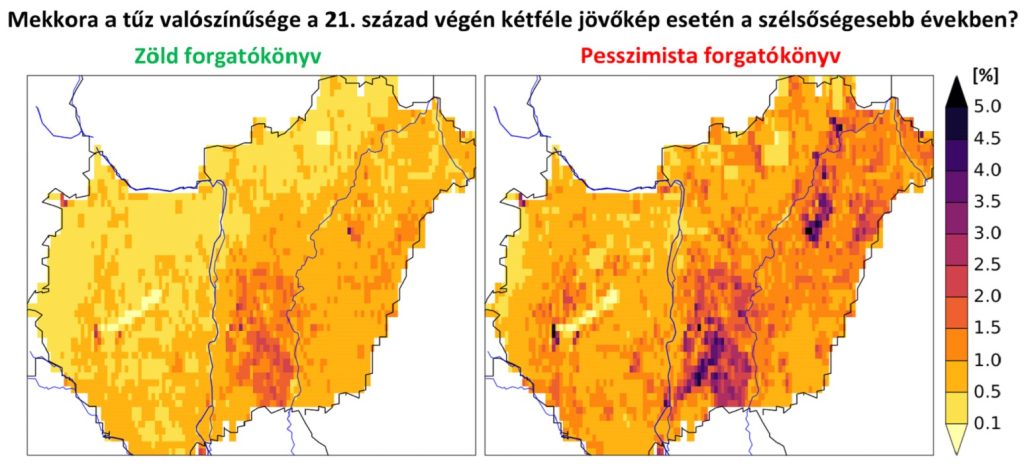 Ez nemcsak a rendkívüli években, hanem az átlagos években is jelentősen több tüzet jelentene. A legveszélyeztetettebb térségek közé tartozik a Duna–Tisza köze déli fele, a Balaton nyugati vidéke és a Hortobágy tágabb térsége. Egészen más képet mutat a „zöld” forgatókönyv: ha gyorsan és jelentősen csökkentjük a kibocsátásokat, a tűzgyakoriság alig változik a század végéig.