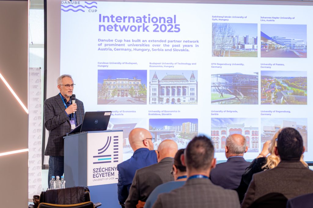 A Danube Cup nemzetközi egyetemi hálózatot dr. Danyi Pál alapító mutatta be. „A mozgalmat kilenc évvel ezelőtt indítottuk, jelenleg öt ország tíz felsőoktatási intézménye adja az aktív tagságot. Víziónk, hogy motivált és sikeres vállalkozói szellemű hallgatókat képezzünk, hozzájárulva egy olyan sikeres régióhoz, amelyben az új, innovatív egyetemi ötletek hatékonyan és eredményesen kerülnek át az üzleti életbe” – fogalmazott. Elárulta: legfrissebb terveikben szerepel, hogy vállalkozói tréninget, kollaboratív képzési rendszert hozzanak létre a hálózat egyetemei számára.