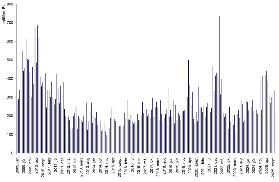 Az azonnali részvénypiac forgalma összességében 333 milliárd forintot tett ki októberben, amely a napi átlagot tekintve 15,9 milliárd forintot jelent.