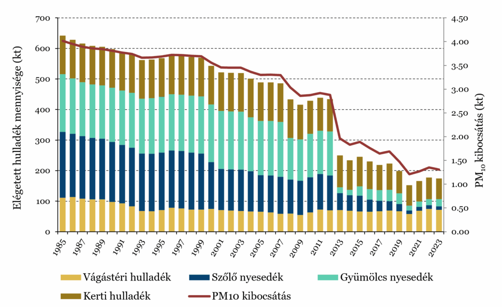 A legfrissebb, 2023. évre vonatkozó jelentés szerint országos viszonylatban az avarégetésből származó éves részecskekibocsátás mindössze 2% körüli, és mint az alábbi grafikonon látszik, trendje csökkenő (természetesen korrelál az elégetett avar/zöld hulladék mennyiségével).
