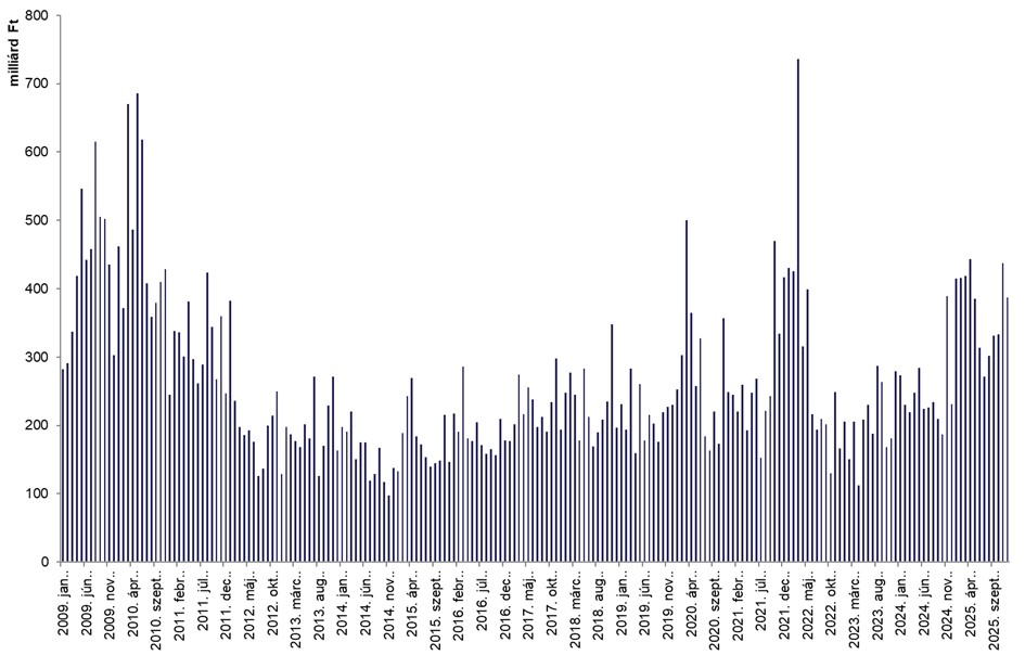 A kereskedési aktivitás az év során változatosan alakult, a legnagyobb havi forgalom áprilisban volt 442,9 milliárd forinttal. Az éves összforgalom 4 453 milliárd forintot ért el, decemberben pedig 387 milliárd forintnyi ügylet teljesült, 20,4 milliárd forintos napi átlag mellett.