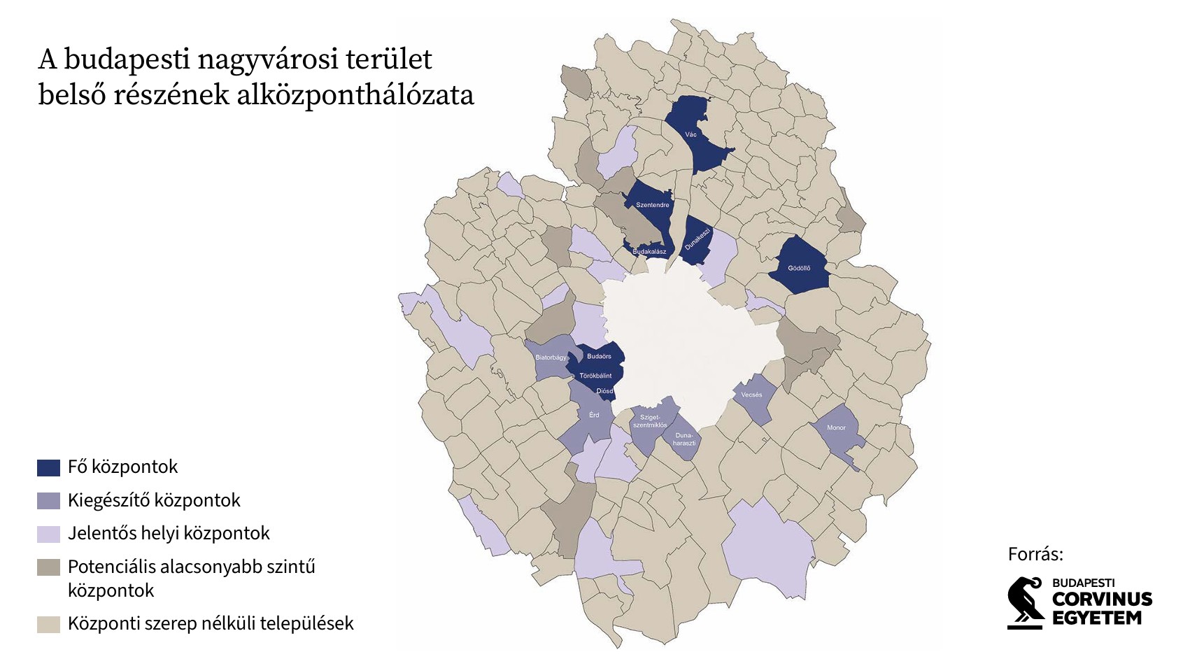 A Budapesti Corvinus Egyetem két kutatója, Kocsis János Balázs és Varga Virág a budapesti nagyvárosi térség 203 települését vizsgálta a régióban játszott szerepük alapján, eredményeiket a Journal of Urban Affairs folyóiratban közölték. A szerzők szerint a főváros sajátos városfejlődése miatt a „klasszikus” értelemben vett alközpontok kialakulása a városon belül ugyanis korlátozottan értelmezhető.