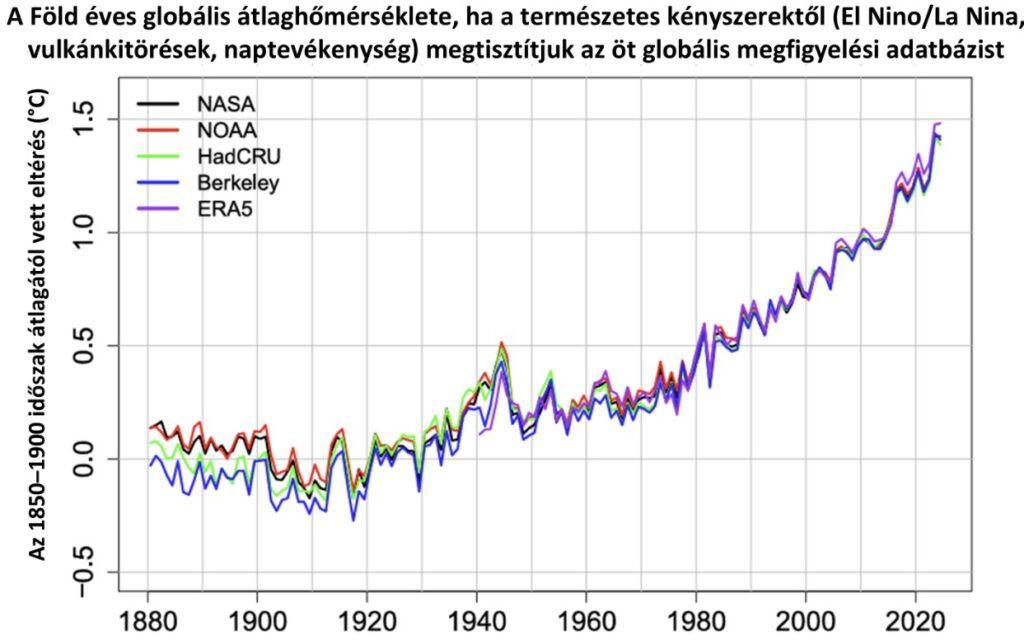 Az öt független és a természetes ingadozásoktól megszűrt globális adatbázis mindegyikén jól látszik, hogy a Föld melegedése már nem egyenletes: 2014 után töréspont jelenik meg, amelytől kezdve a felmelegedés üteme meredekebbé válik. A statisztikai vizsgálatok szerint a melegedés gyorsulása 98 százalékos bizonyossággal kimutatható, míg 2023 és 2024 előtt ezt még nem állíthattuk. Az utóbbi bő tíz évben a globális átlaghőmérséklet megfigyeléstől függően már 0,34-0,42 °C-kal emelkedik évtizedenként. Ez jóval meghaladja az 1970-től egészen 2014-ig detektált 0,2 °C/évtized körüli értékeket. A független globális adatsorok szerint a világ az ipari forradalom előtti időszakhoz képest 1,5 °C-os melegedési szintet már akár 2026-ban és legfeljebb 2029-ben biztosan eléri.