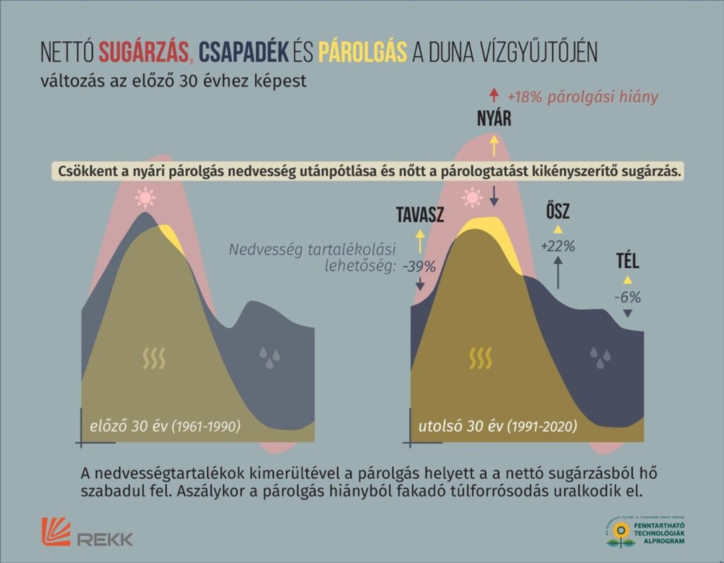 A párolgási–párologtatási deficit azt a hiányzó vízmennyiséget jelenti, amelynek elpárologtatása elmarad, ezért a felszínt érő napenergia nem tud látens hő formájában eltávozni, hanem közvetlenül felmelegíti a talajt, és az a levegőt. A Másfélfokon megjelent elemzés konkrét adatokkal mutatja meg ennek erősödését: a Duna-medencében az 1961–1990 közötti időszakban átlagosan csupán egyetlen hónapban fordult elő, hogy a párolgási igény meghaladta a lehulló csapadékot, míg az 1991–2020-as időszakban ez az állapot már átlagosan három nyári hónapra terjedt ki. Ez nem pusztán időbeli eltolódást jelent, hanem azt is, hogy a nyári időszak egyre nagyobb részében működik korlátozottan a természetes hűtési mechanizmus, ami közvetlenül hozzájárul a hőhullámok gyorsabb felépüléséhez és az aszályos állapotok elmélyüléséhez.