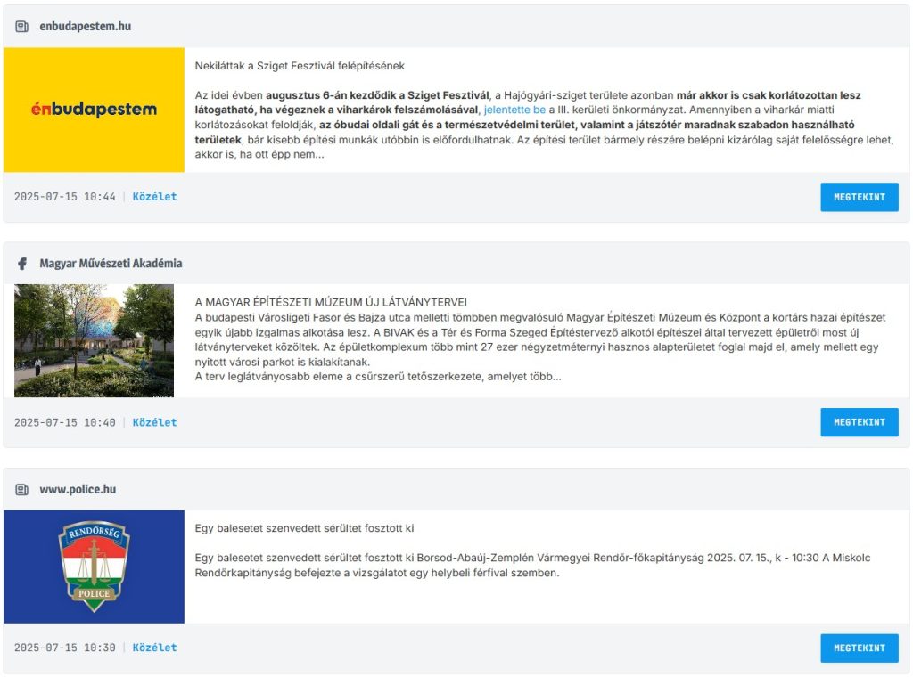 10 percenként frissülő hírfolyamunk célja, hogy az általunk terjesztett sajtóközlemények mellett egy kiegészítő információforrást is biztosítsunk az újságíróknak. A hírfolyam intézményi, szervezeti, szakértői Facebook oldalak és szakmai, tematikus, közszolgálati oldalak bejegyzéseit, valamit az újságírók által hírszemlére ajánlott cikkeket tartalmaz 48 órára visszamenőleg.